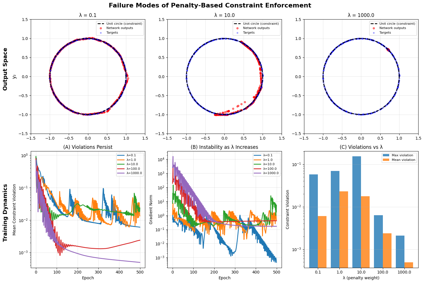 "Penalty methods can approximate the constraint by making large, achieving violations on the order of to . However, this comes at severe costs: gradients become unstable with spikes exceeding , training slows dramatically, and exact constraint satisfaction (violation = 0) is never achieved. As , the optimization problem becomes ill-conditioned. For applications requiring hard constraints satisfaction is insufficient."